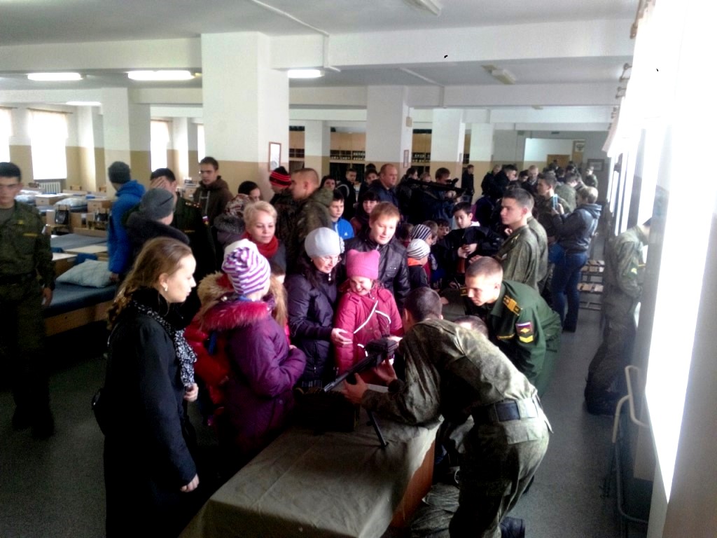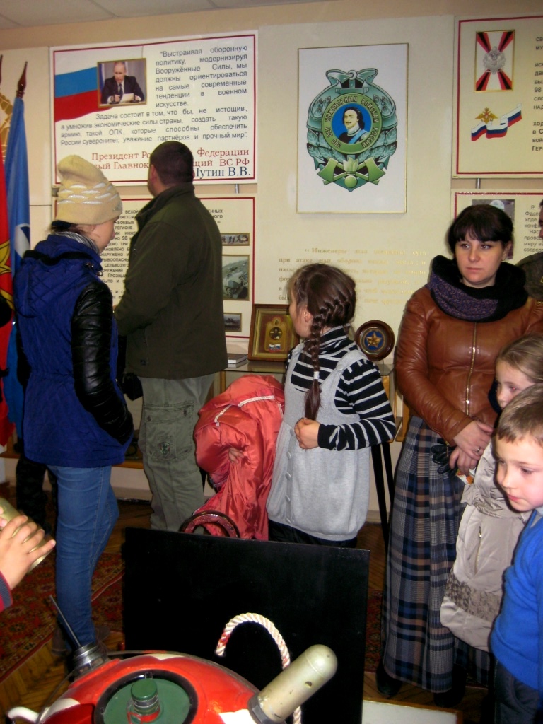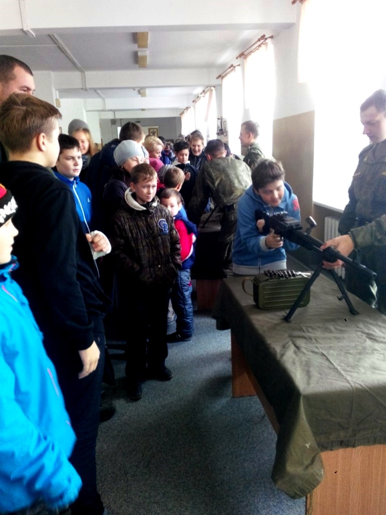 Затем наша большая группа пошла в казарму, где на входе нас встретила шеренга курсантов одетых во все виды военной современной одежды — летняя, зимняя, боевая и спортивная. Рядом стояли столы — на них было оружие, которое можно собрать и разобрать. Потом по чисто выметенным дорожкам мы пошли в музей, в котором было очень много экспонатов — модели техники, старые с войны каски и множество исторических фотографий, экспозиции сражений и другие атрибуты военного дела.